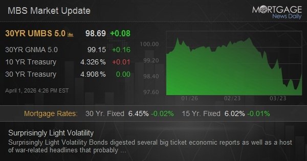 Bonds digested several big ticket economic reports as well as a host of war-related headlines that probably would have caused a much bigger reaction a few weeks ago. But the net effect was an almost perfectly flat day by the 3pm CME close. If anything, the data caused some weakness and we can say bonds would have rallied more noticeably otherwise. The weak response is no surprise considering all 3 reports were stronger than expected. This also serves as a reminder that Friday’s jobs report is still a relevant market mover despite a general focus on the war and energy prices.