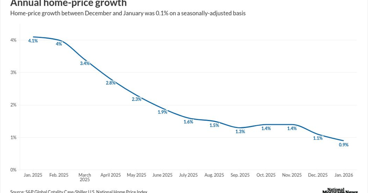 Home prices rose 0.9% year-over-year and 0.1% month-over-month in January, according to the S&P Cotality Case-Shiller national home price index. Both points were
