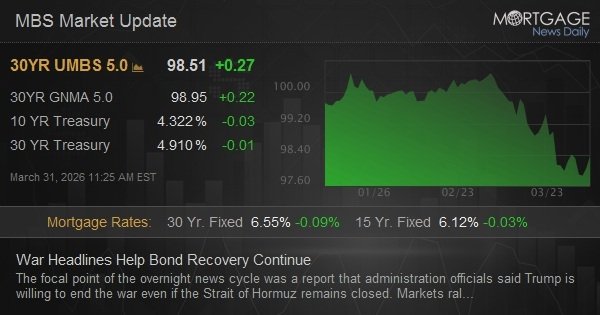 The focal point of the overnight news cycle was a report that administration officials said Trump is willing to end the war even if the Strait of Hormuz remains closed. Markets rallied nearly as much just before the open when Trump said the hard part is essentially done on the Iran war (and that other countries should just go take their own oil now, or buy it from the U.S.). The initial move took yields from 4.36 to 4.33 and the pre-open rally was 4.34 to 4.30–“moderate,” but notable as it is happening on the day after an already big rally. War headlines remain in focus despite econ data ramping up. If 10am ET job openings data is spicy enough, it could command some attention given that the “recession fear” trade is thought to be the key reason that bond yields defied higher oil prices yesterday.